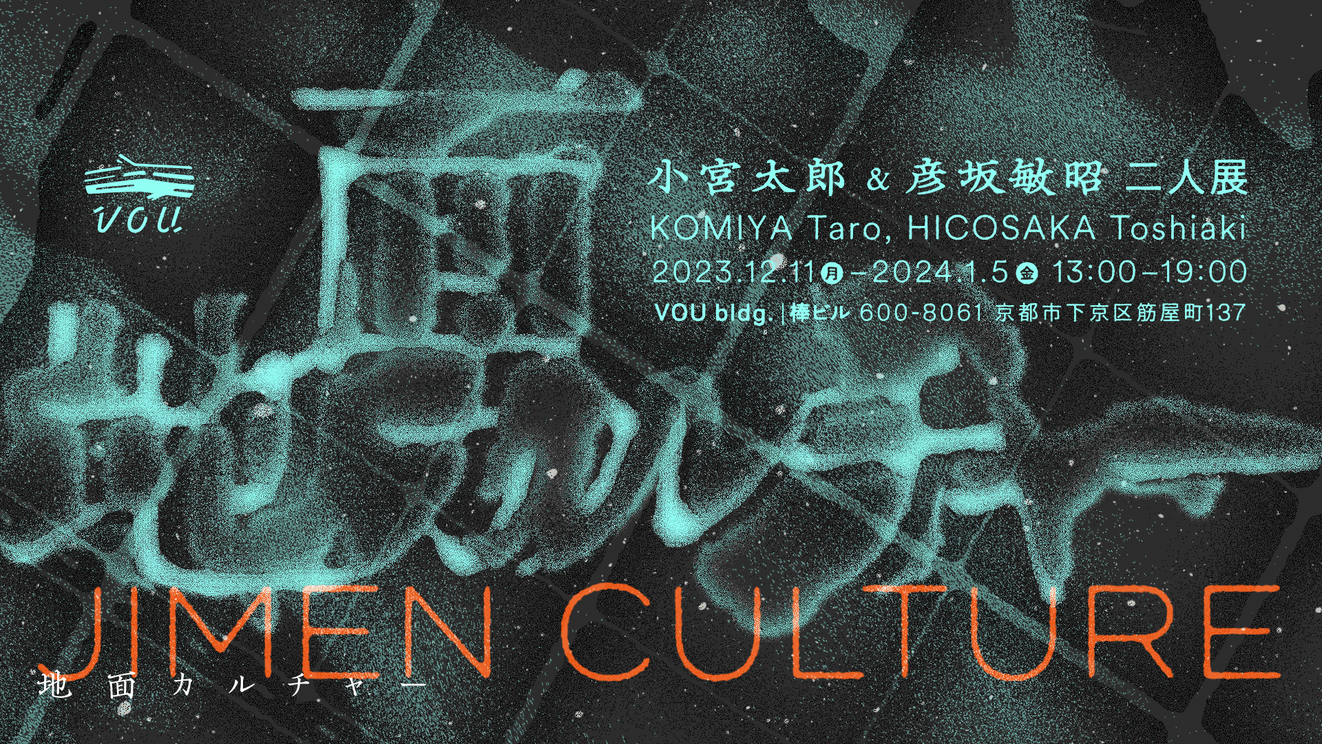 この度VOUにて、2023年12月11日(月)-2024年1月5日(金)まで、小宮太郎と彦坂敏昭による二人展「地面カルチャー」を開催いたします。共に1980年代生まれの二人の美術作家は、世の中のさまざまな事象に対し独自のアプローチで触れることを試みてきました。そして、それぞれのプロセスで生成された現象を扱い、他者と感じ考えるための素材として機能する表現を展開してきました。